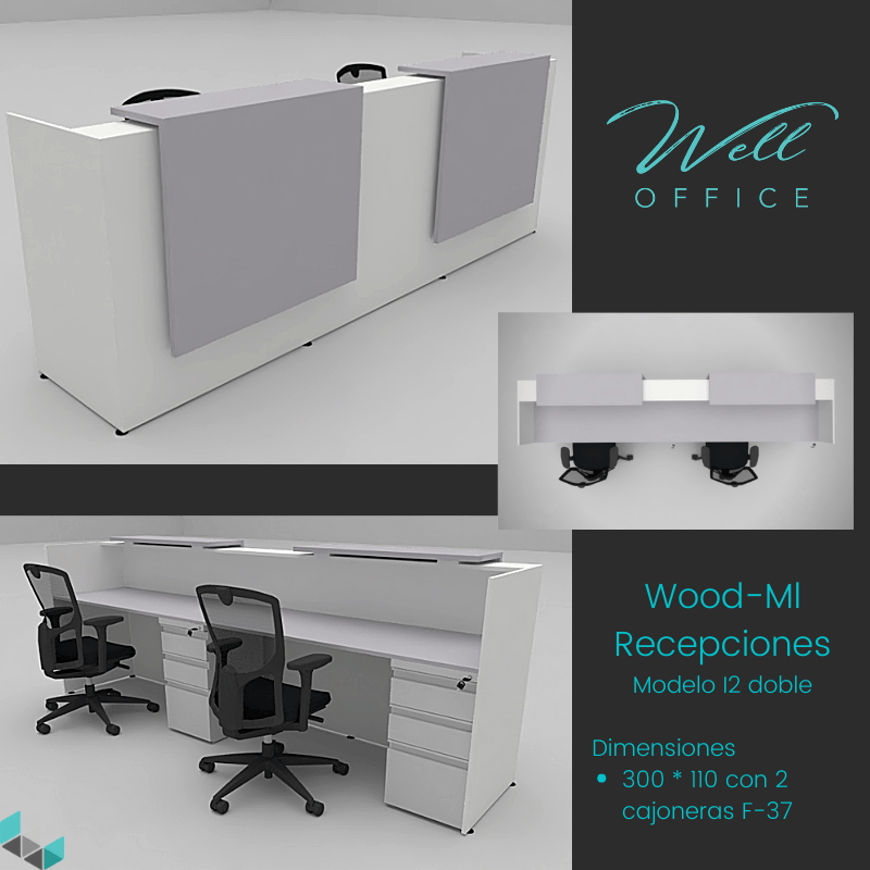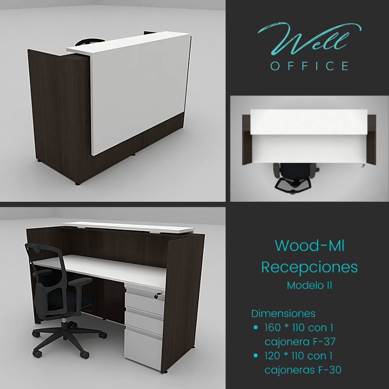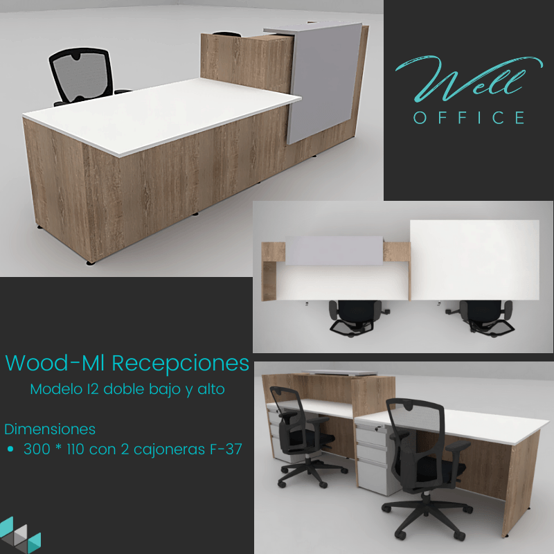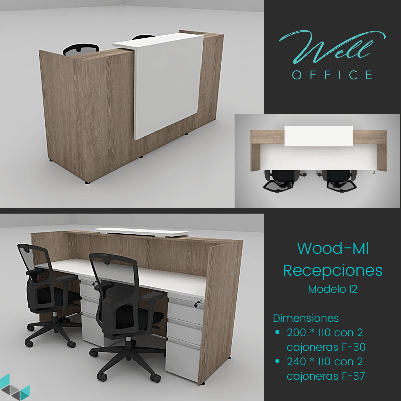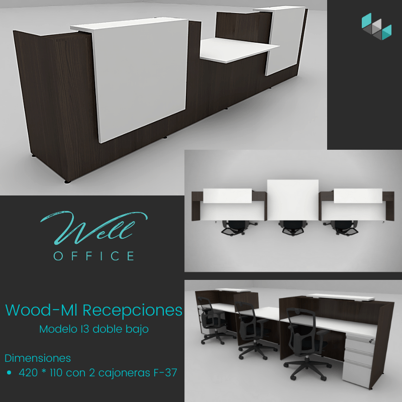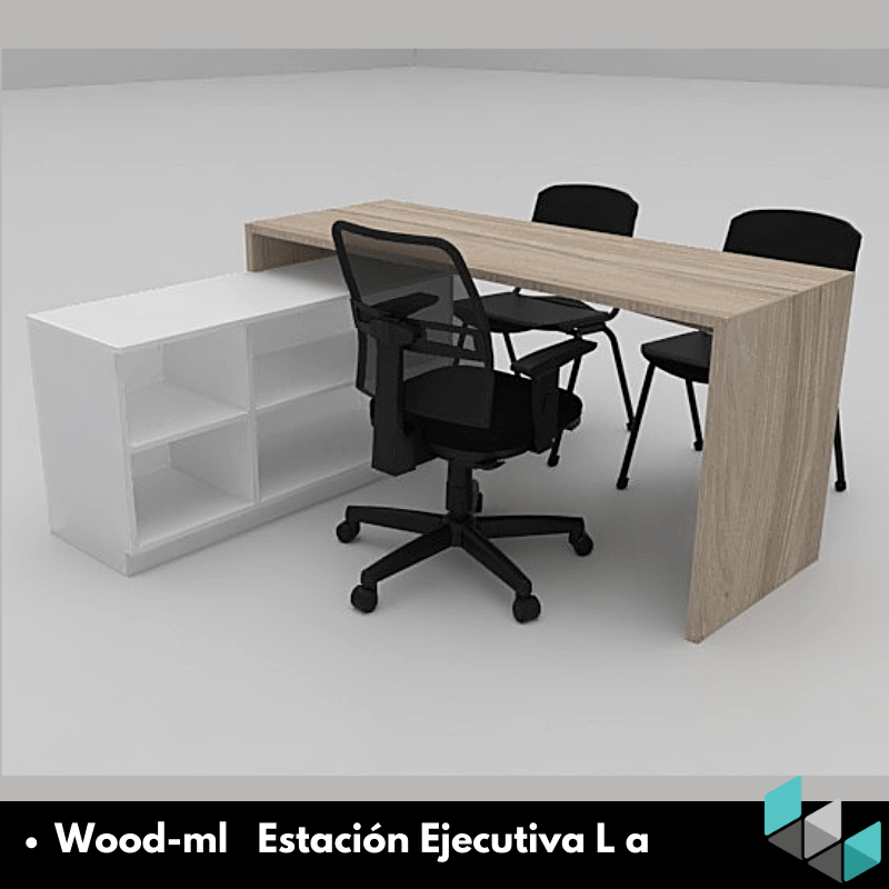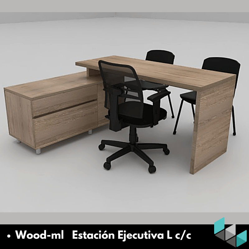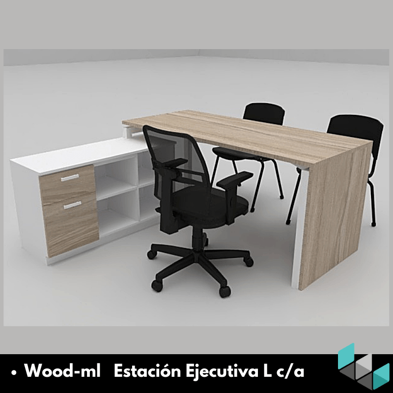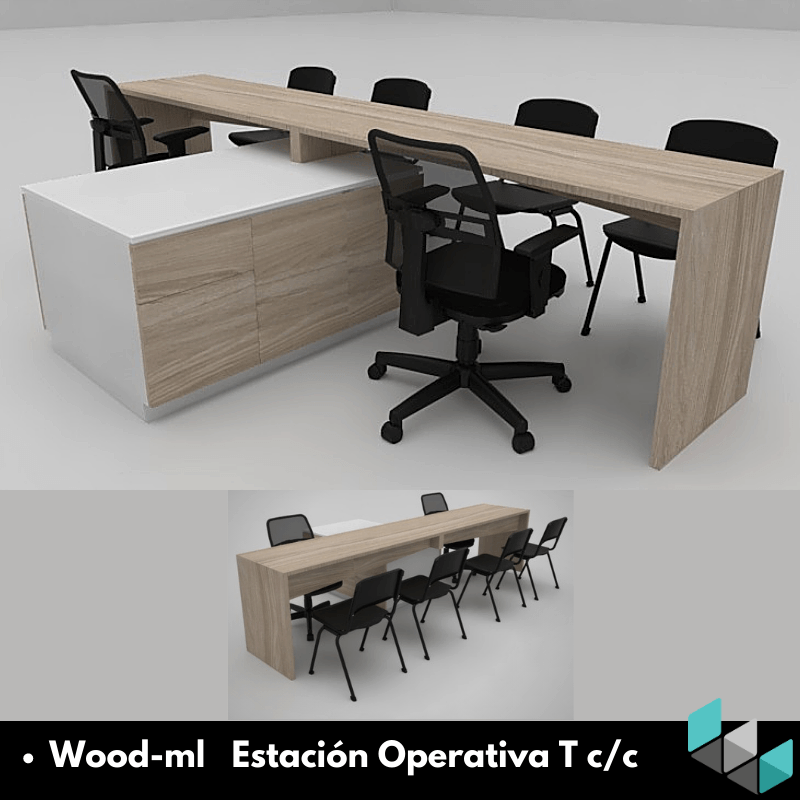 Estaciones LINEA WOOD-ML, elaboradas todas en tableros melaminicos con muebles auxiliares tipo credenzas.