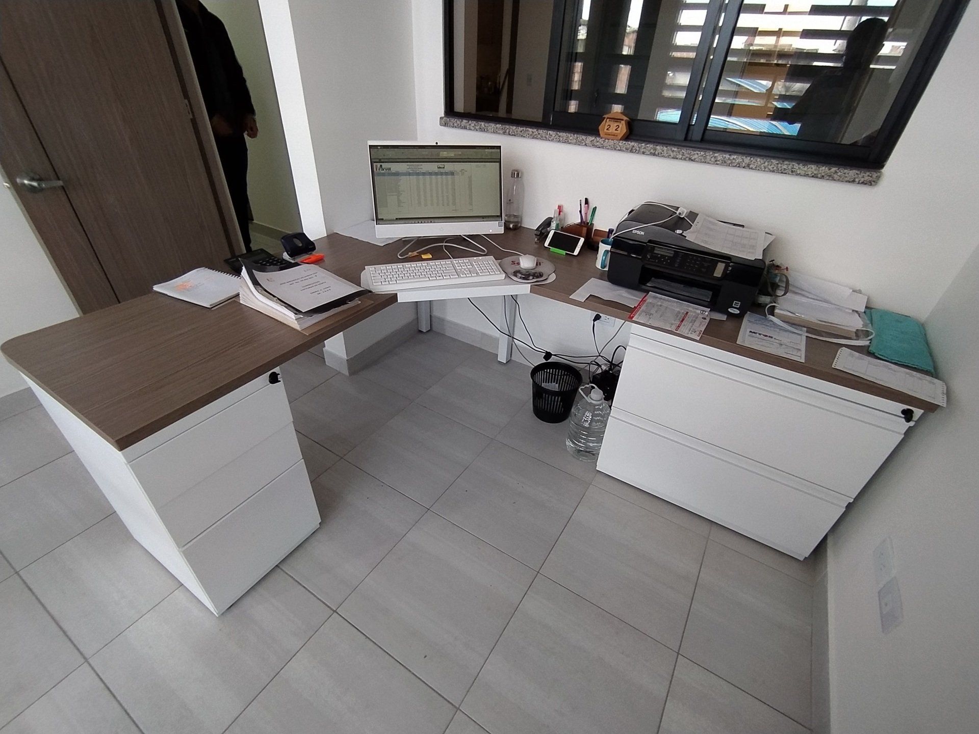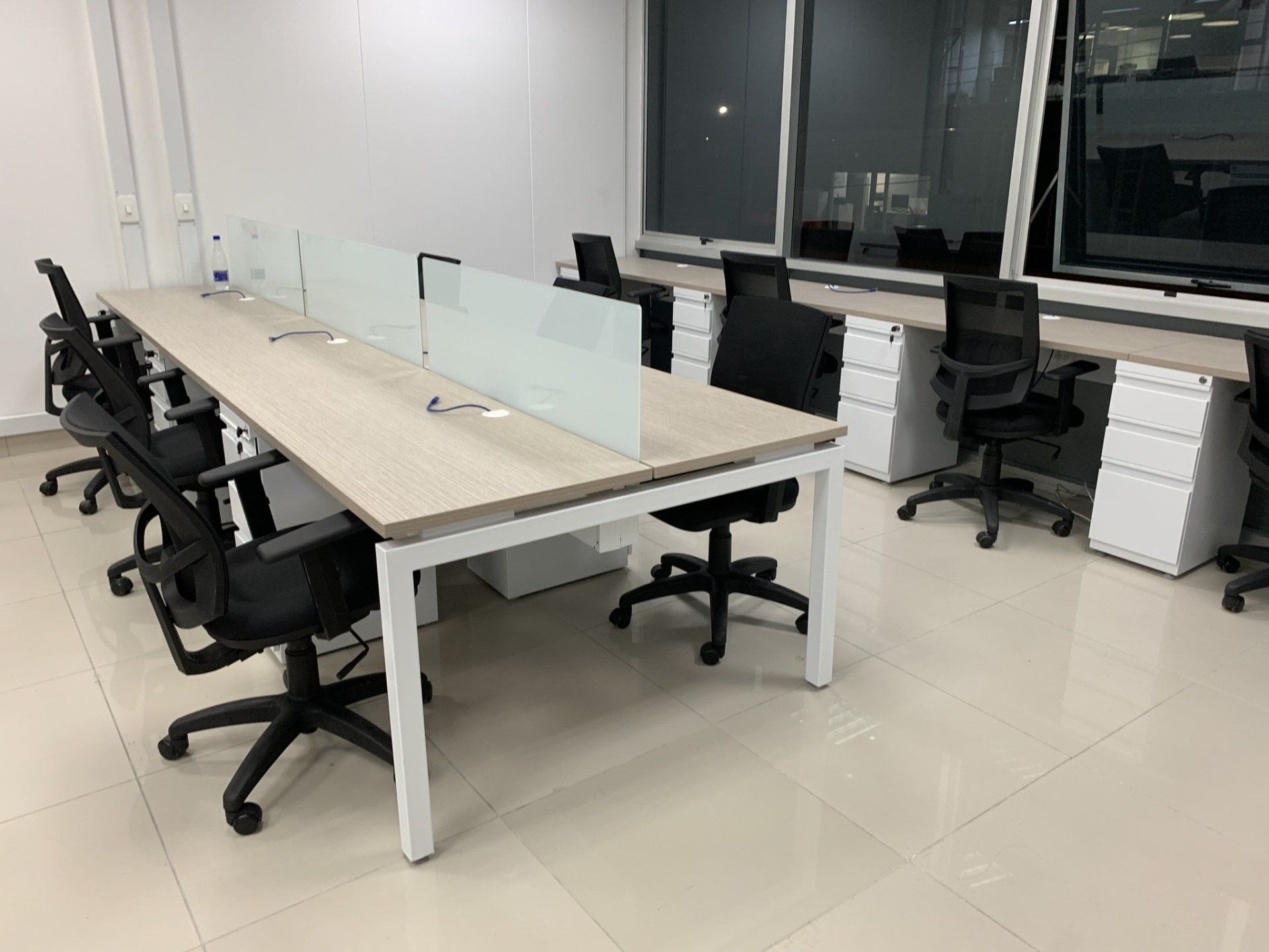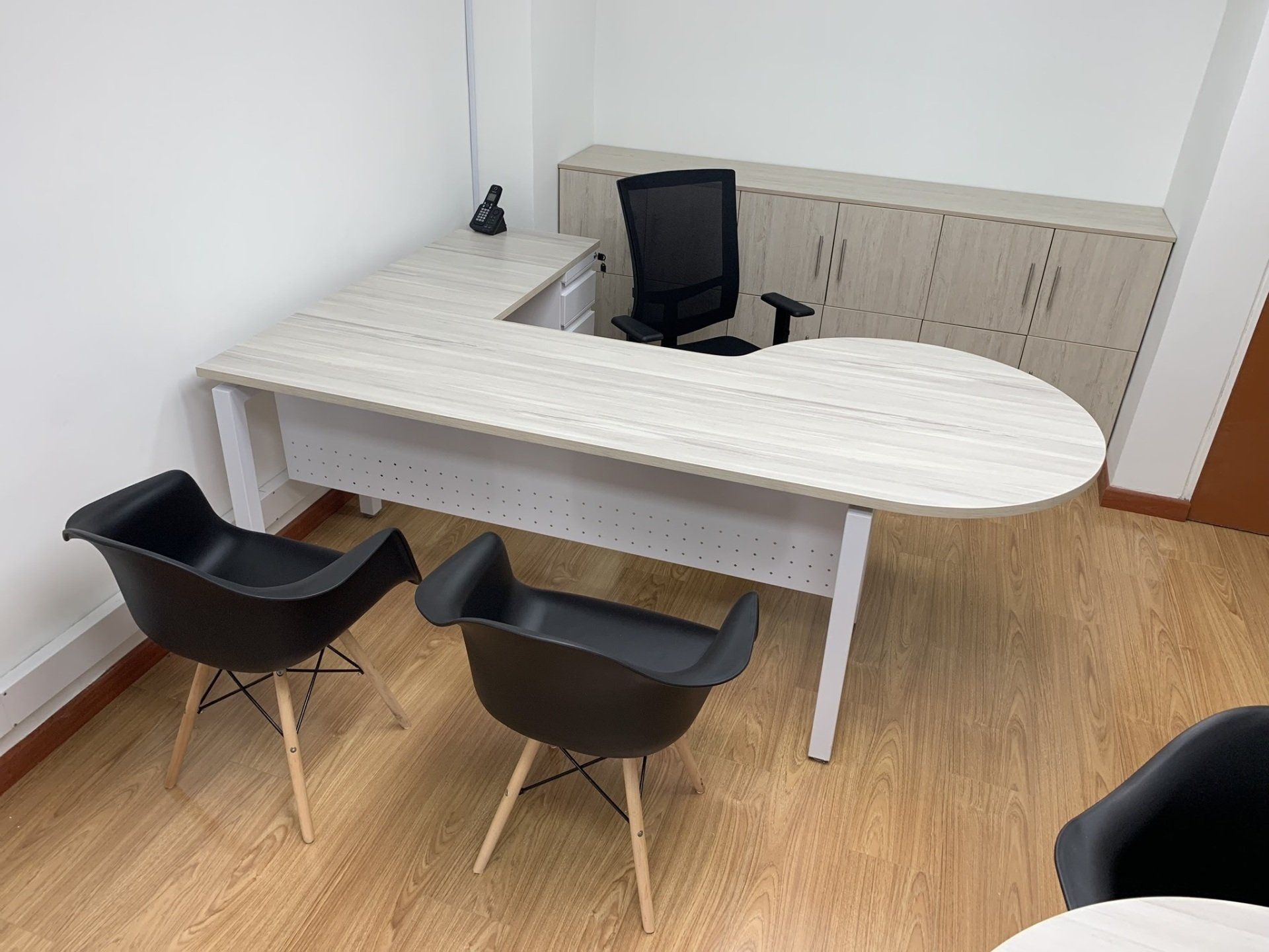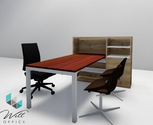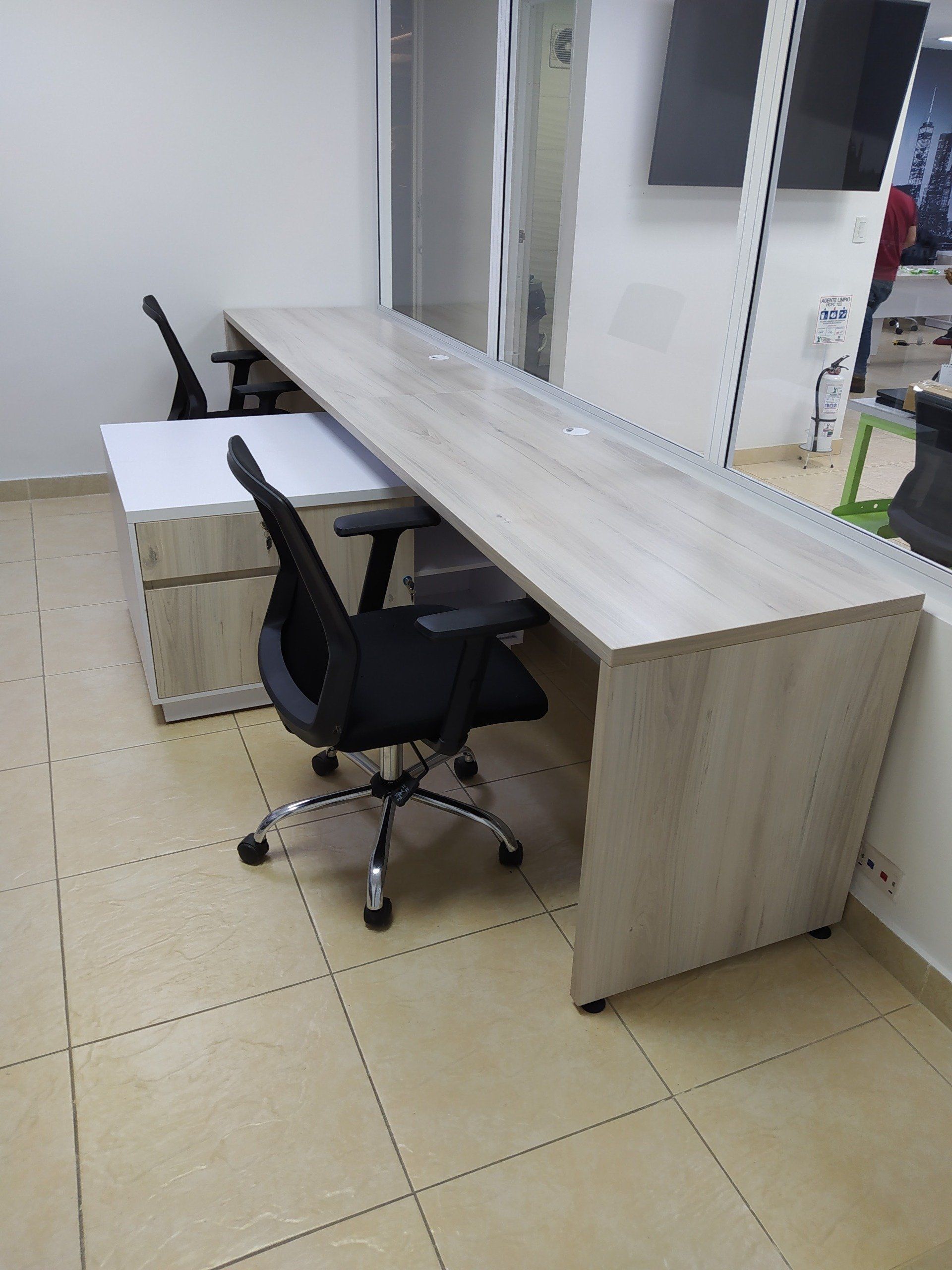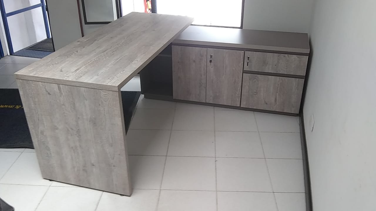 Estaciones LINEA WOOD-ML, elaboradas todas en tableros melaminicos con muebles auxiliares tipo credenzas.